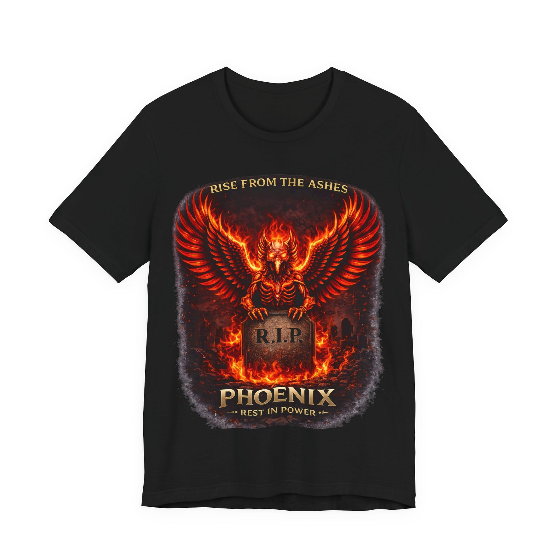 This design captures a relentless phoenix rising from the flames of destruction, standing over what once was. With glowing eyes and burning wings, it symbolizes the end of an old version of yourself and the emergence of something far stronger. The tombstone marks what's been left behind - fear, weakness, limits - while the fire represents rebirth, evolution and unstoppable force.